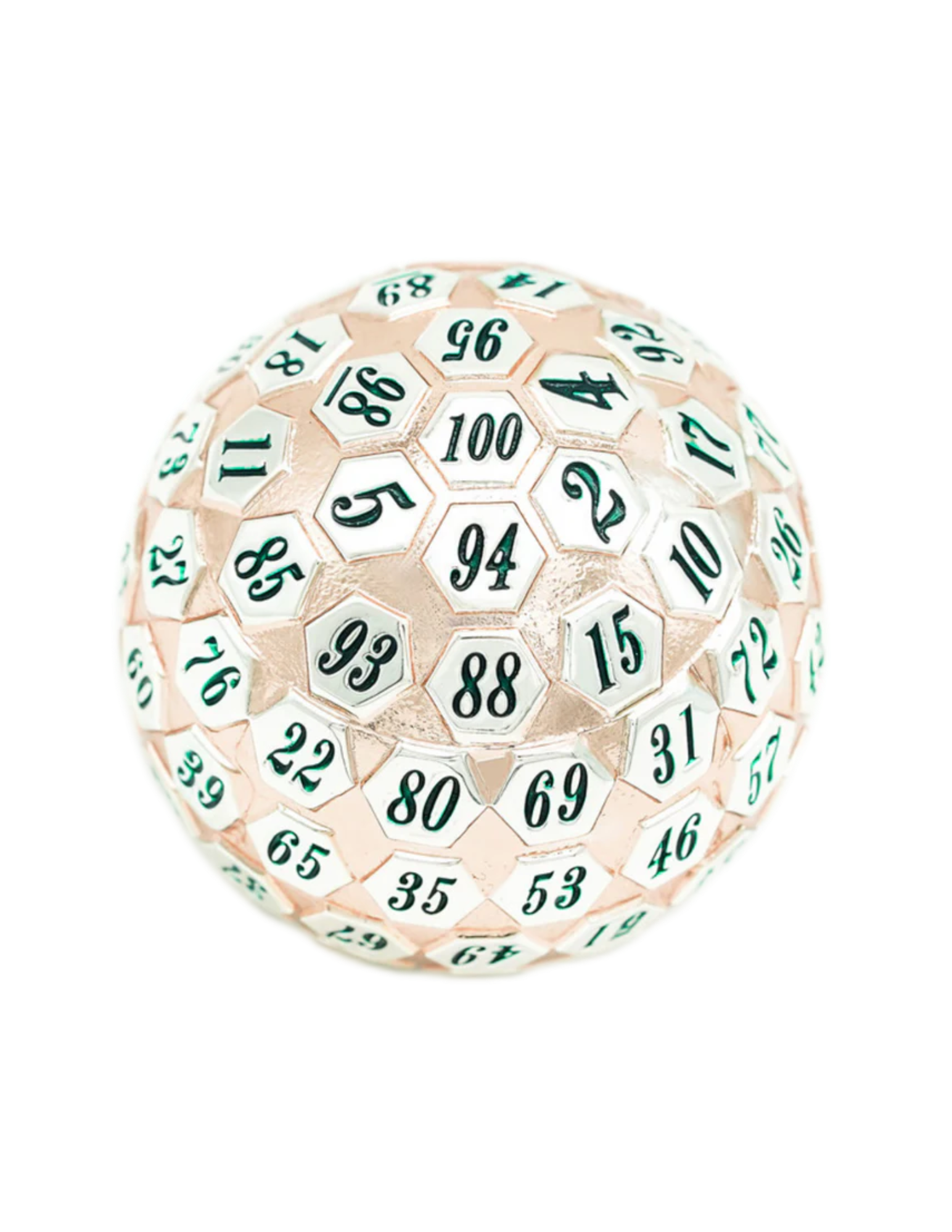 A 100-sided die, or D100, invented by Lou Zocchi in 1985, is sometimes called a Zocchihedron or "Zocchi's Golfball." Rather than being a true polyhedron, it is more like a ball with 100 flattened planes and is designed to handle percentage rolls in games, particularly in role-playing games.