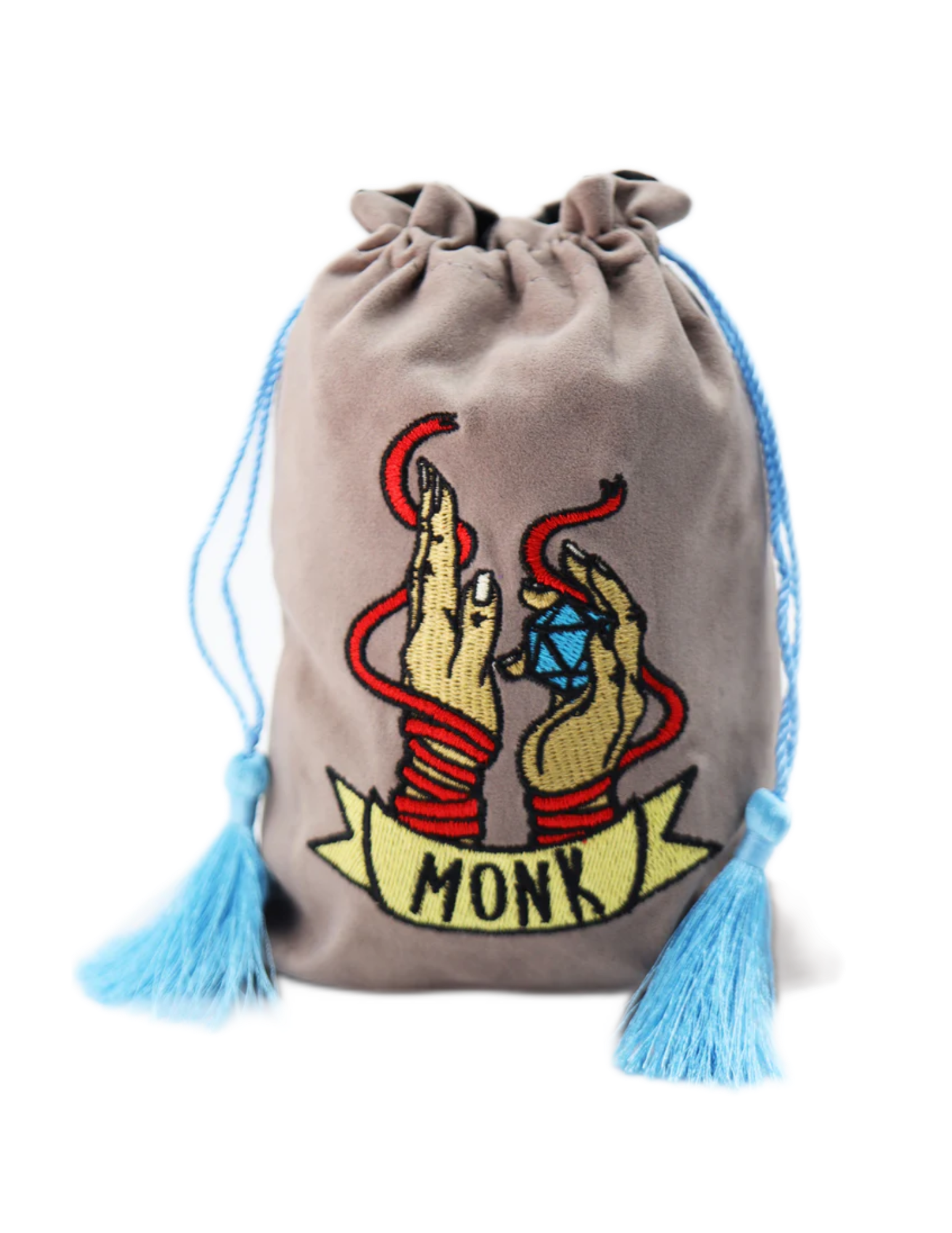 This dice bag is big enough to hold several sets of dice while not being bulky. It has an embroidered design on faux suede with a drawstring closure.