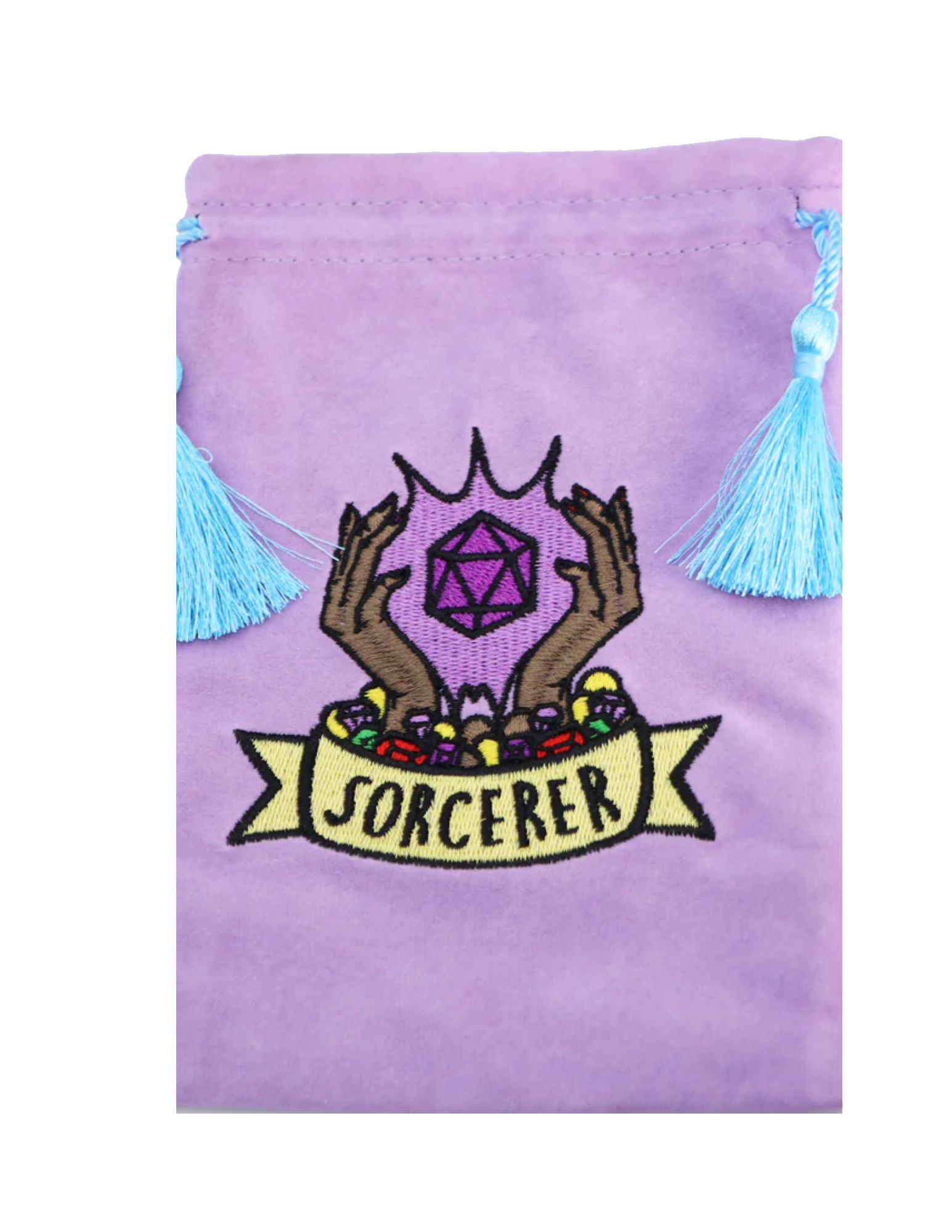 This dice bag is big enough to hold several sets of dice while not being bulky. It has an embroidered design on faux suede with a drawstring closure.
